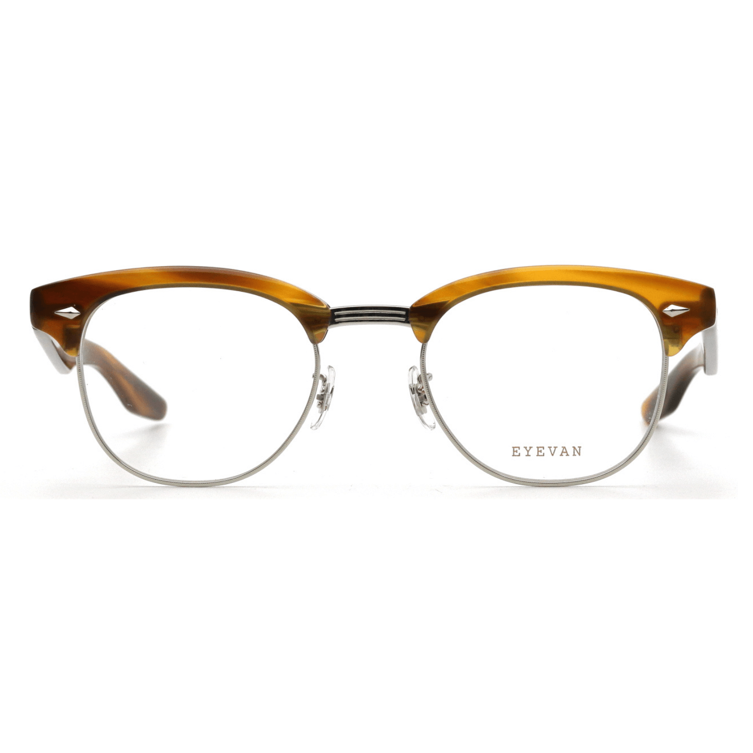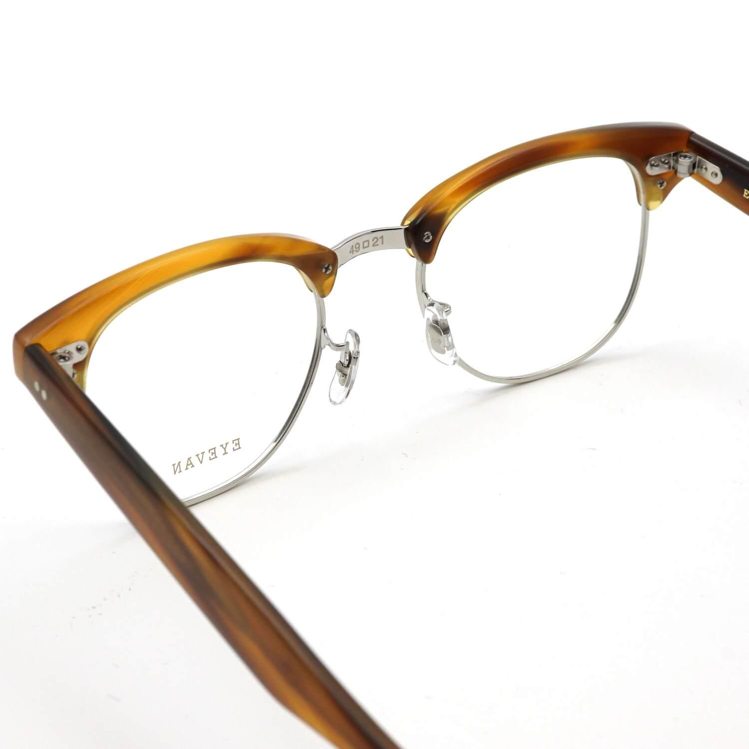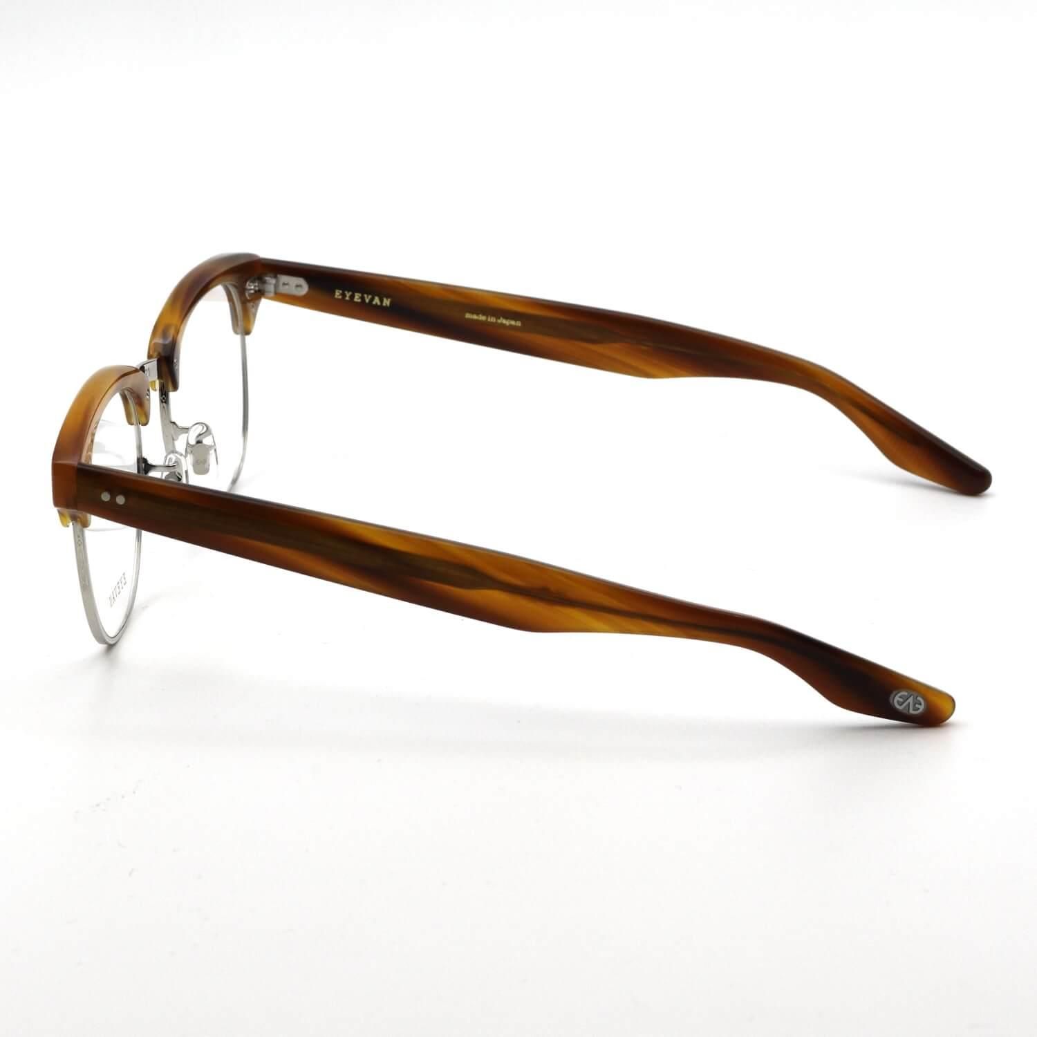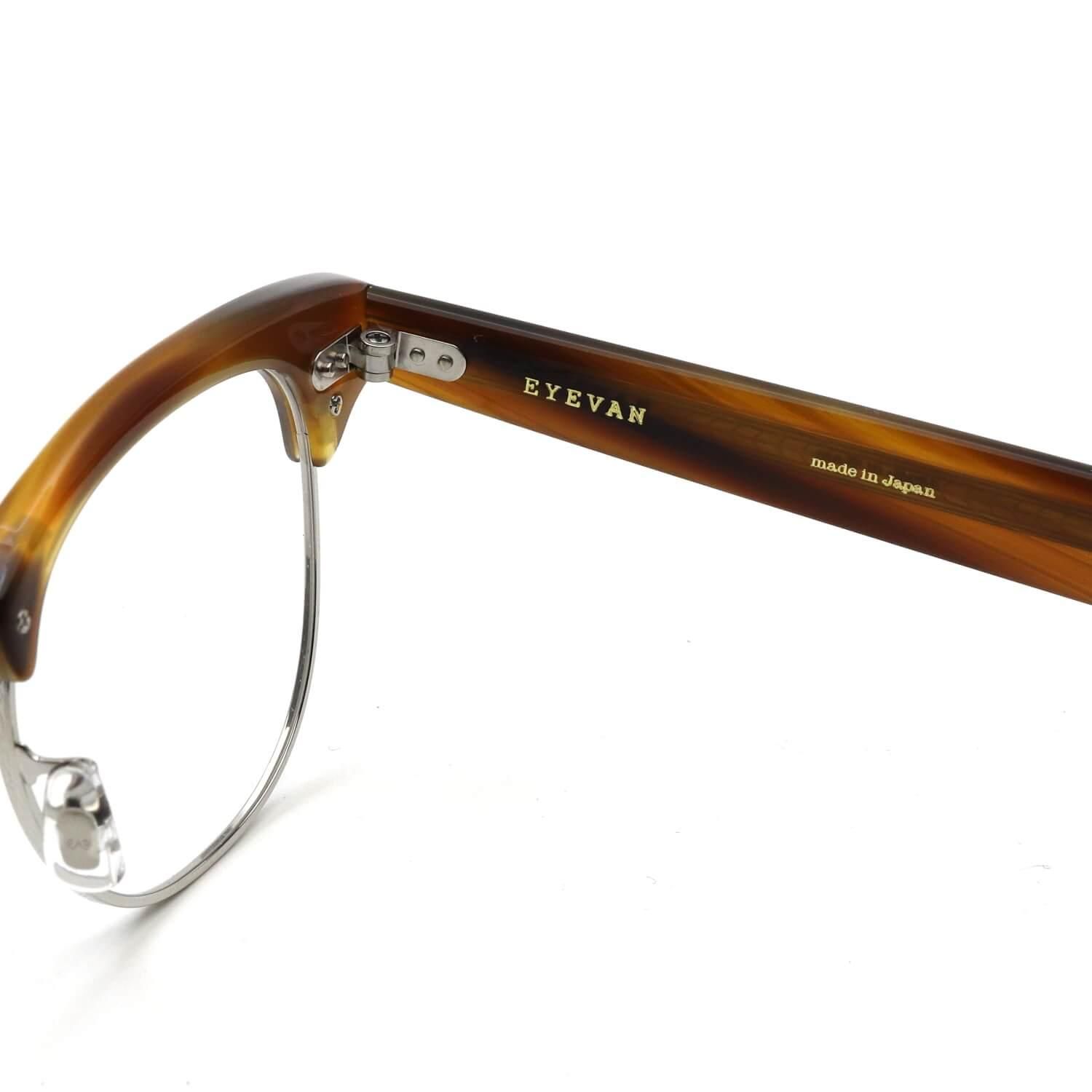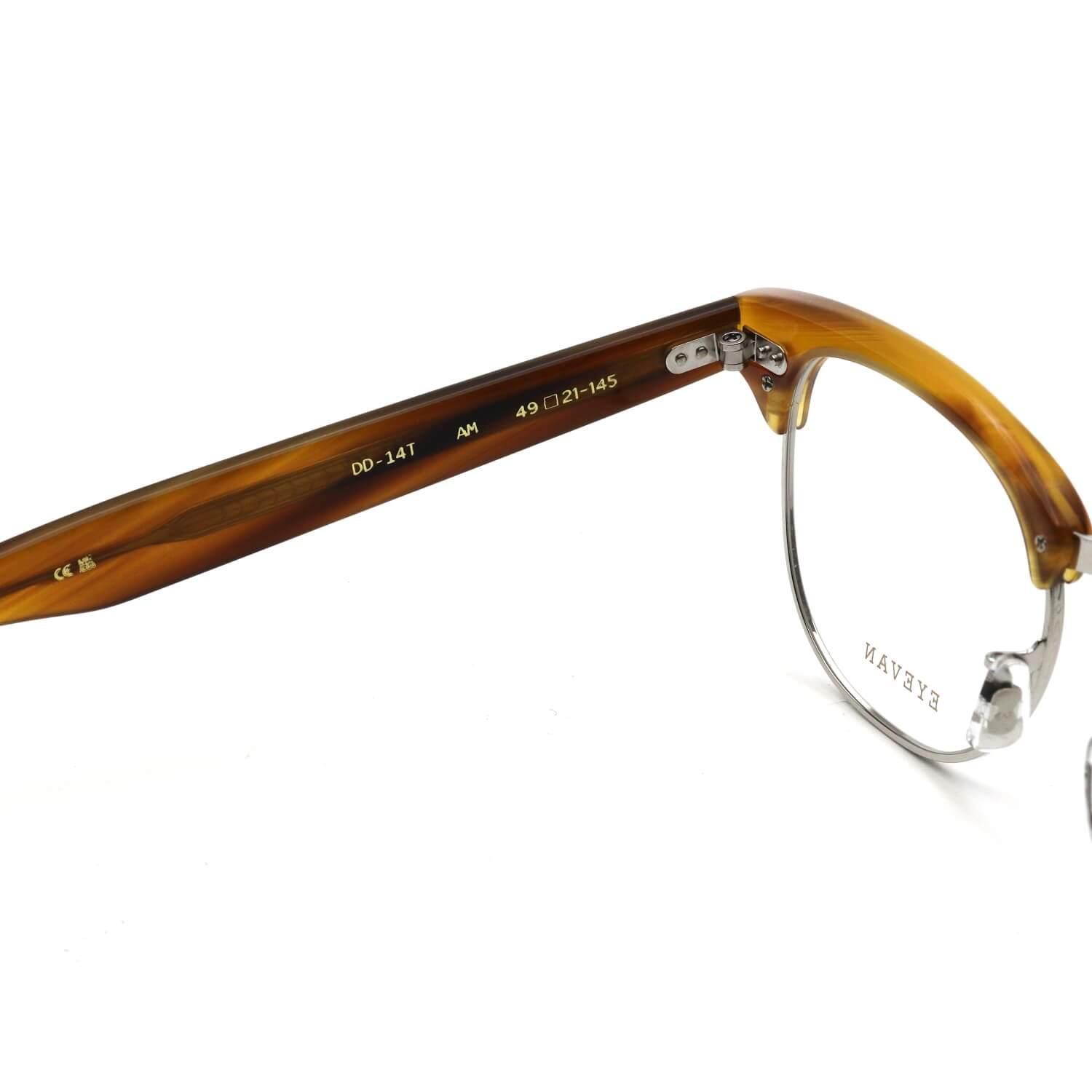 【DD-14T】は、1980年代に発売されたEYEVAN唯一のサーモントブロウ「DD-14」をベースにしたモデル。ブロウパーツとレンズのバランスを調整し、素材をチタンに変えてアップデートされています。ヨロイのかしめパーツはオリジナルを元に忠実に復刻。ブロウ内部の隠れている部分にも、1960年代にアメリカで流行していた「スピードライン」の模様を施した秀逸な一本です。