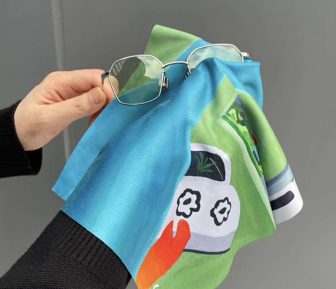 【 Thank you】は、ドローイングアーティストのSUGI氏とのコラボ作品。普通では考えられない状況を自ら楽しみ、高揚できるコミュニケーションツールになって欲しいとデザインされています。メガネ拭きとしてはもちろん、額縁に入れてアートとして飾ったり、スカーフのように首やカバンに巻くなど幅広く使えます。