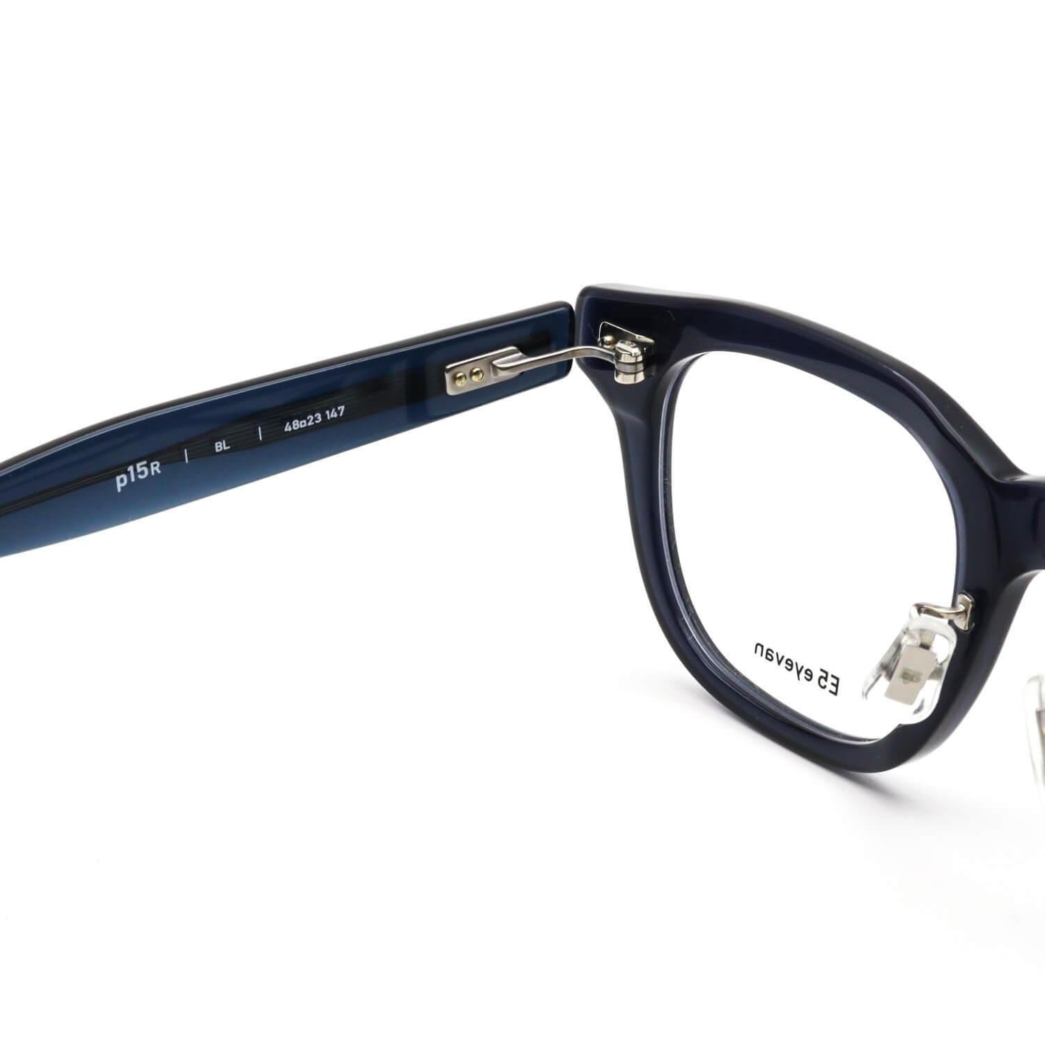 【p15R】は,全体的に肉厚でボリュームのあるウェリントンシェイプ。フロントに使用しているプラスチック生地は、高密度で変形が少なく、経年変化しにくい「Highcount acetate」。テンプルを長く幅を広く設計することで、側頭部に接する面積が広くなり、フィット感抜群です。見た目に反して掛け心地がとても軽いので、「ボリュームのあるフレームを掛けたいけれど、重みを感じたり、疲れるのは嫌」という方には特におすすめです。