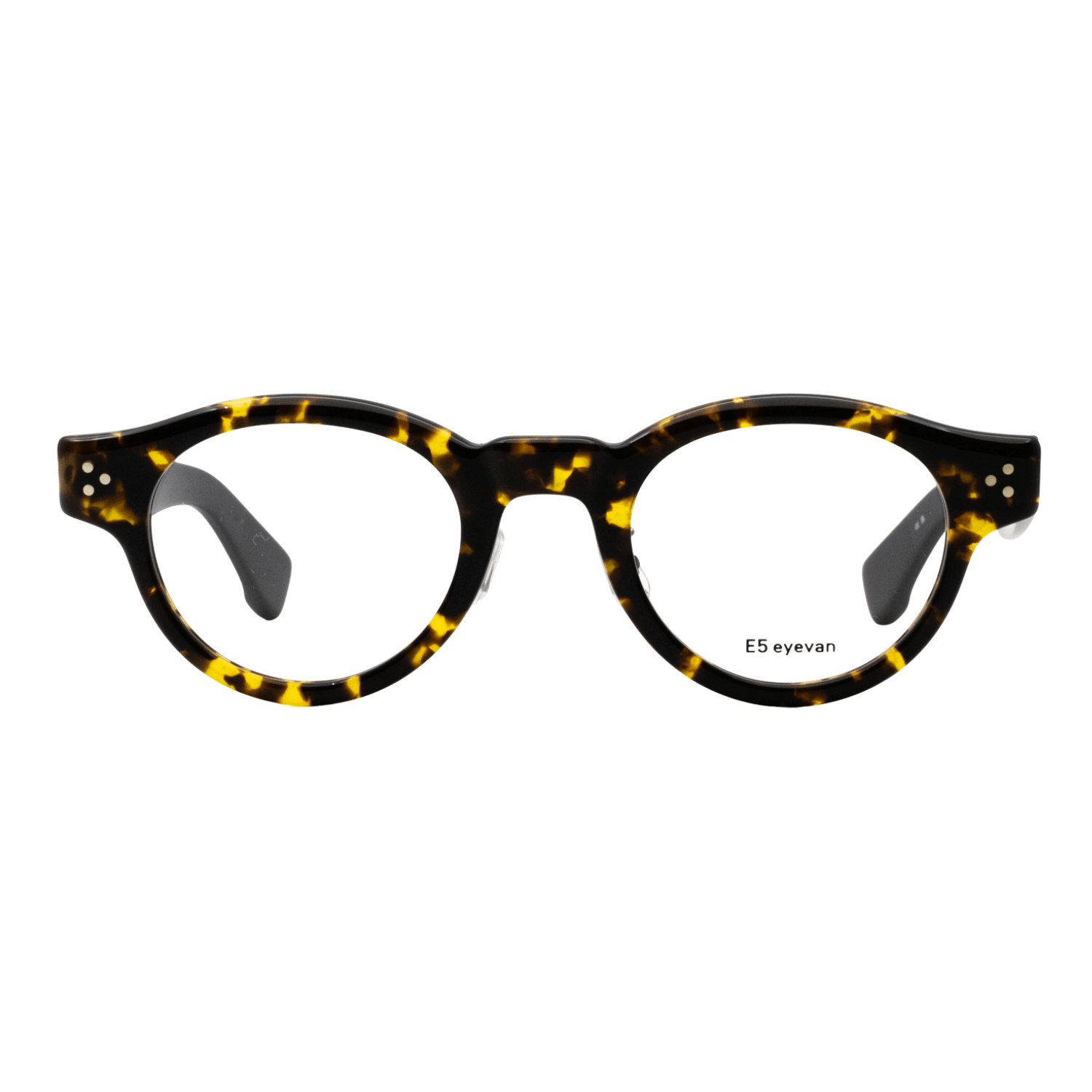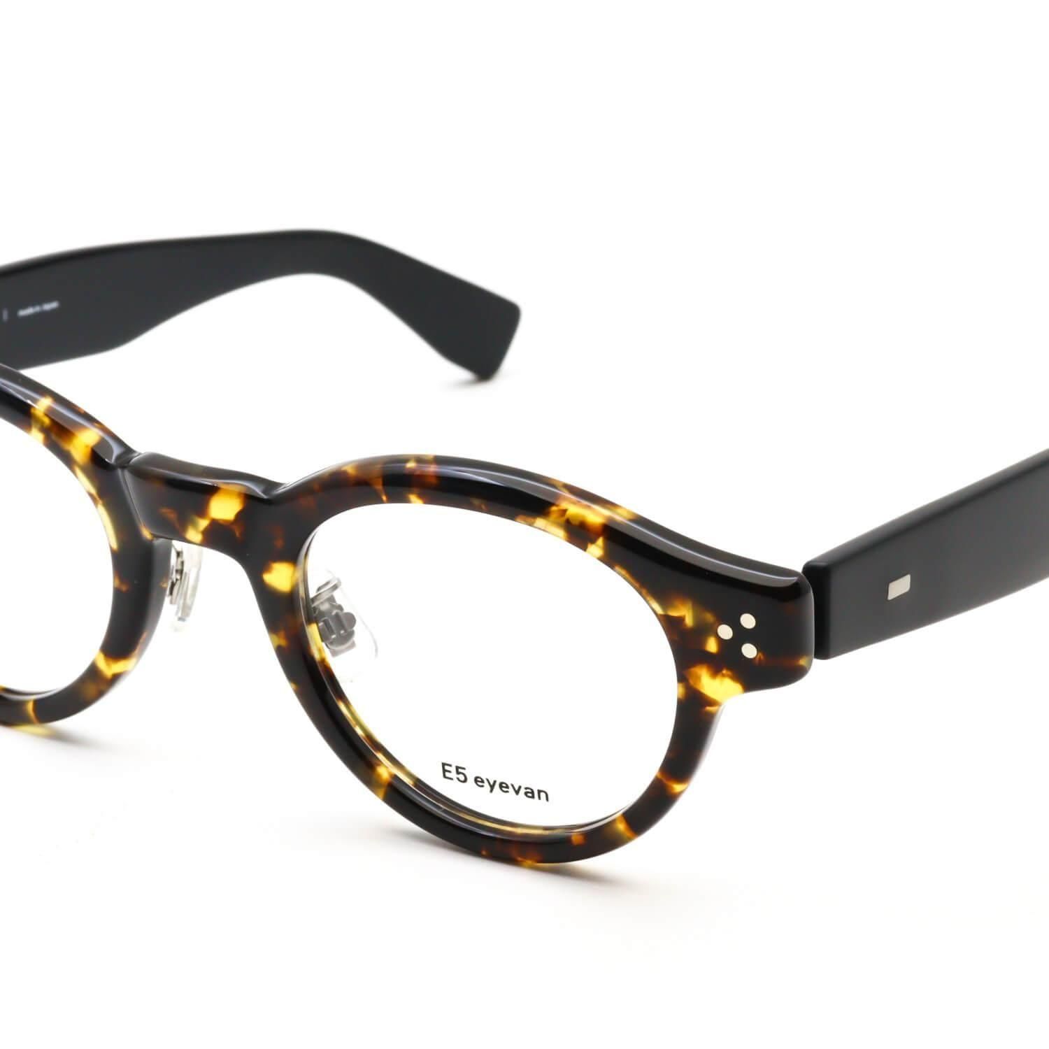 【p27】モデルは、アメリカンヴィンテージを思わせるボストン型のデザイン。 存在感のあるフレームながら、驚くほど軽く、顔に自然と馴染むフィット感を実現しています。フロントには、高密度で変形しにくく、汗や皮脂の影響を受けにくい特殊素材「Highcount acetate(ハイカウントアセテート)」を採用。経年変化にも強く、美しさが長く続くのが魅力です。 E5の特徴でもあるL字型の丁番は、快適な掛け心地と調整のしやすさを追求して生まれた独自構造で、日常的に使いやすい設計になっています。 今回のモデルでは、天地幅のある極太テンプルに合わせて新たにフロント丁番も開発し、3PINでしっかり固定することで強度をさらに向上させました。