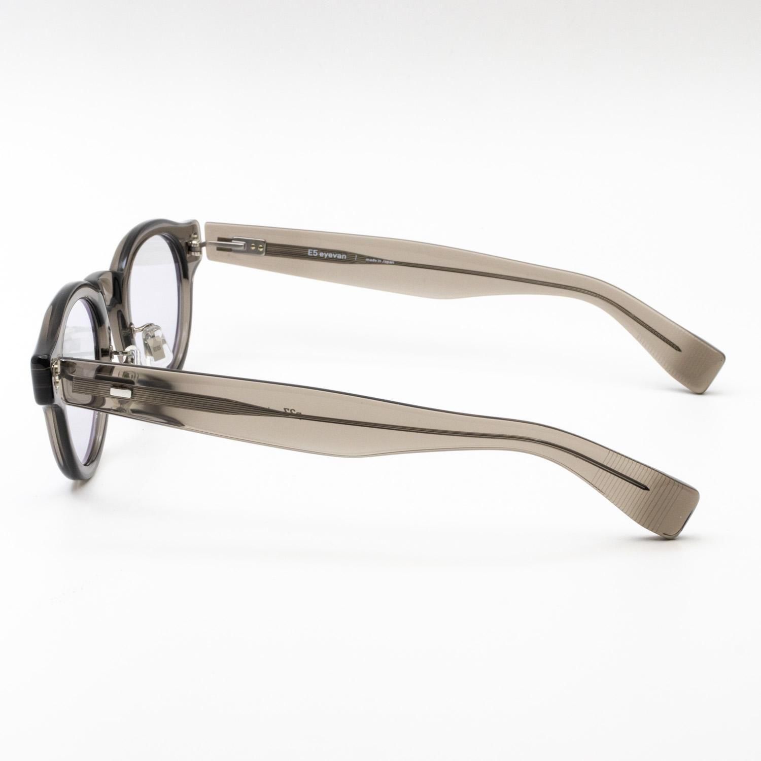 【p27】モデルは、アメリカンヴィンテージを思わせるボストン型のデザイン。 存在感のあるフレームながら、驚くほど軽く、顔に自然と馴染むフィット感を実現しています。フロントには、高密度で変形しにくく、汗や皮脂の影響を受けにくい特殊素材「Highcount acetate(ハイカウントアセテート)」を採用。経年変化にも強く、美しさが長く続くのが魅力です。 E5の特徴でもあるL字型の丁番は、快適な掛け心地と調整のしやすさを追求して生まれた独自構造で、日常的に使いやすい設計になっています。 今回のモデルでは、天地幅のある極太テンプルに合わせて新たにフロント丁番も開発し、3PINでしっかり固定することで強度をさらに向上させました。