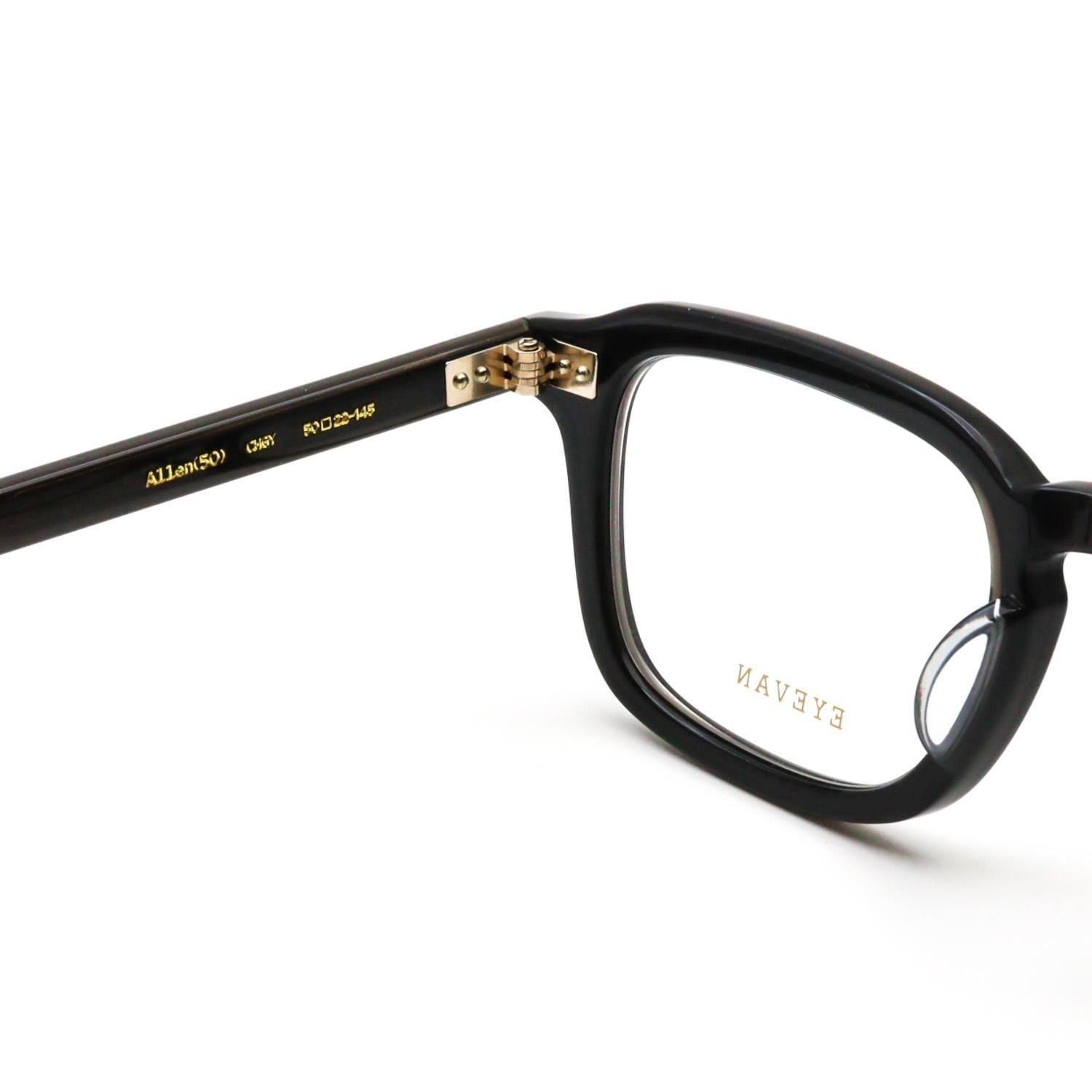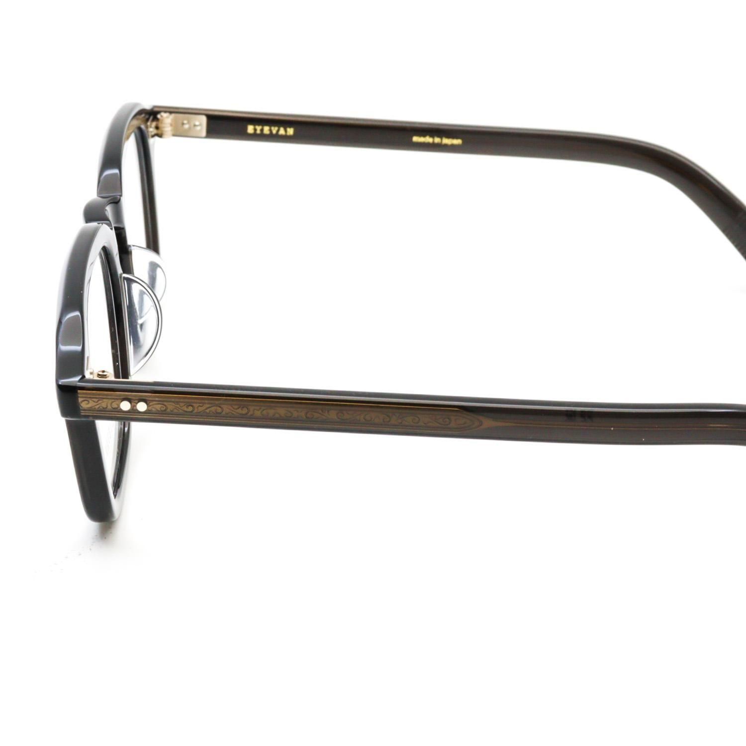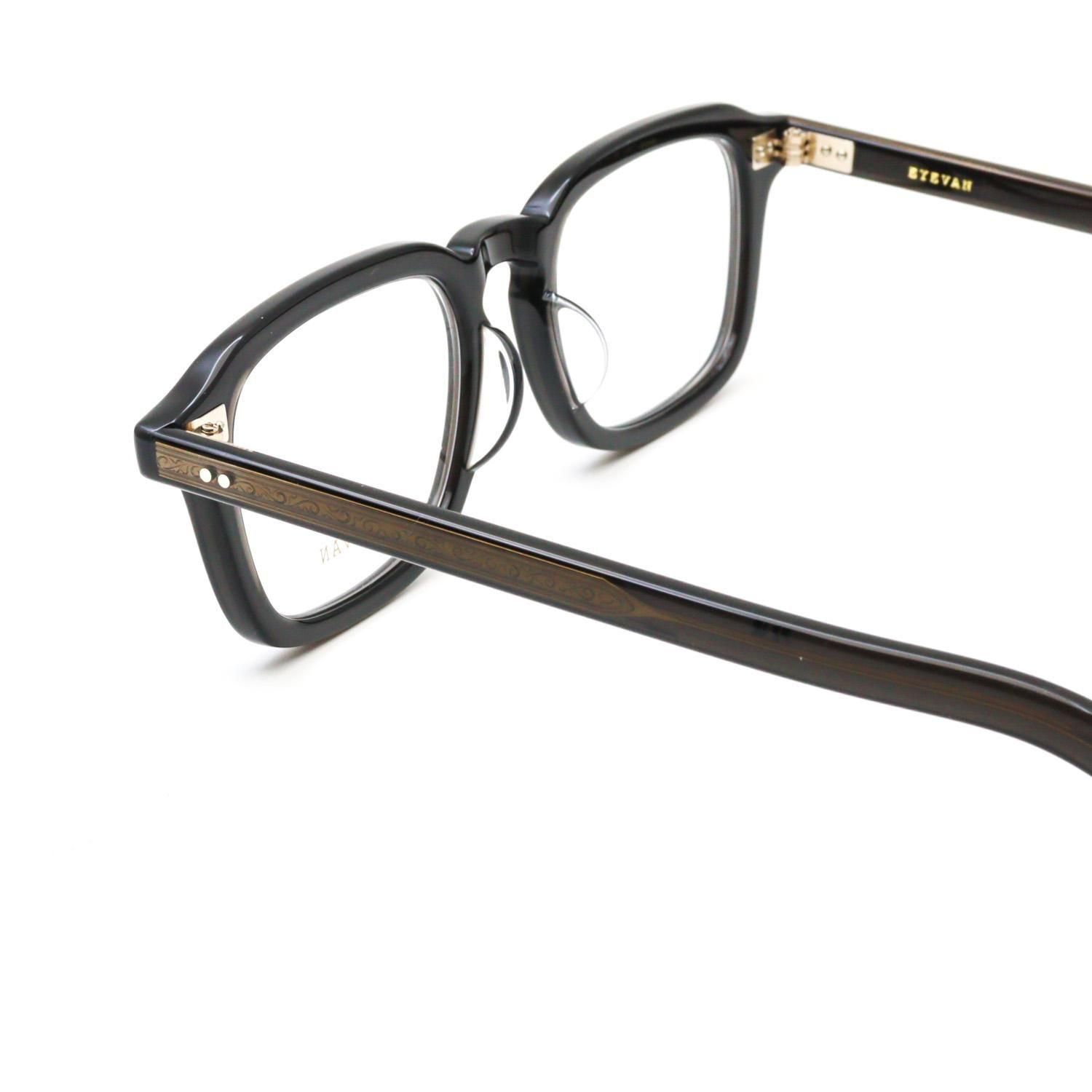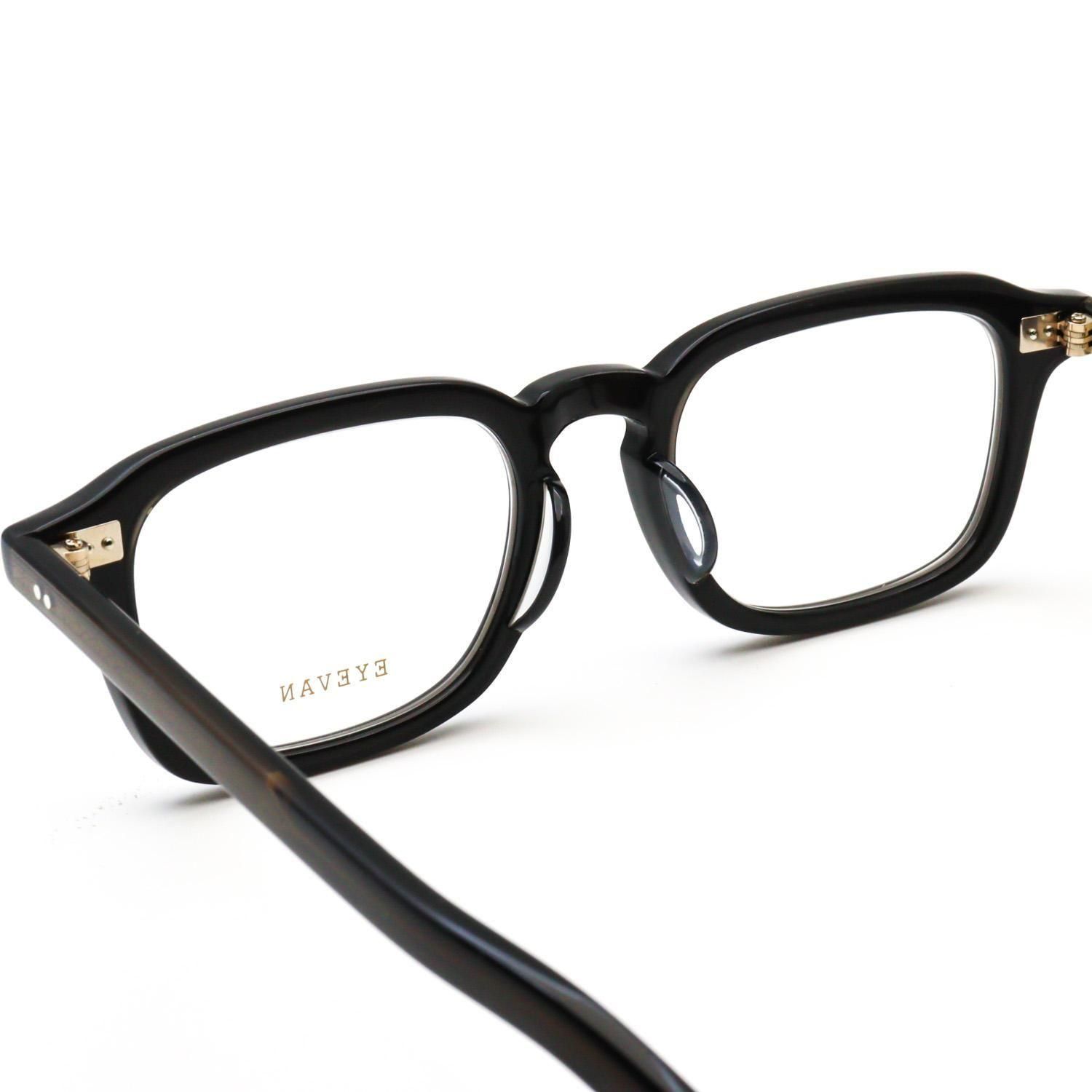 横に長いフロントシェイプに、ブリティッシュヴィンテージで見られる細長いレクタングル(長方形)の要素をほどよくミックス。ヨロイにはサンプラチナ製の飾り丁番をあしらい、全体をシンプルかつ上質に仕上げています。クラシックな形にストリートの雰囲気をさりげなく掛け合わせるという、EYEVAN らしいデザイン手法が光る一本です。