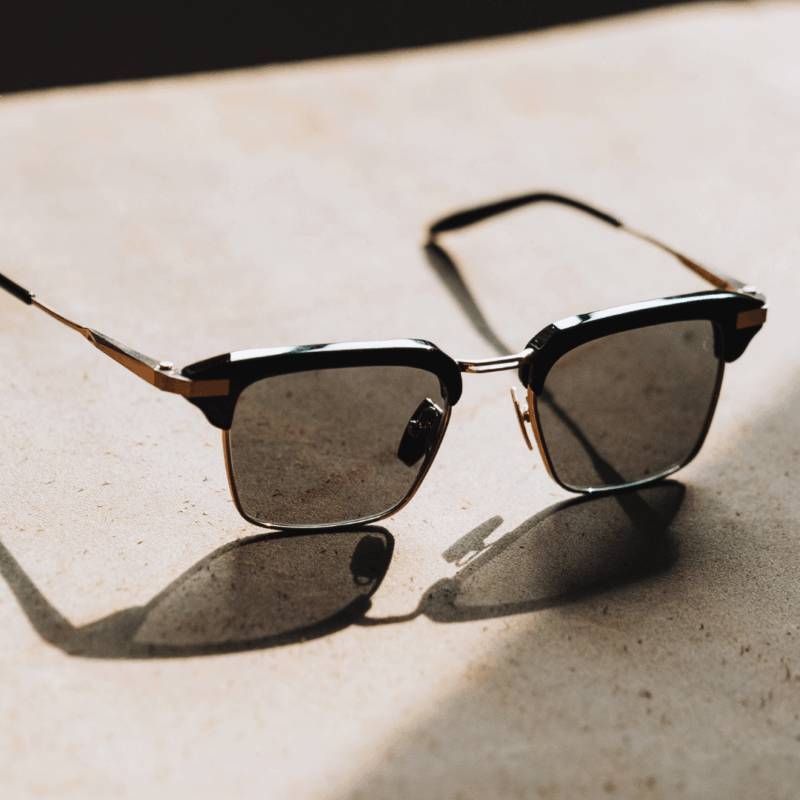 厚みのあるアセテート素材のテンプルと、通常よりも太めに仕上げたチタン製リムのコントラストが特徴です。